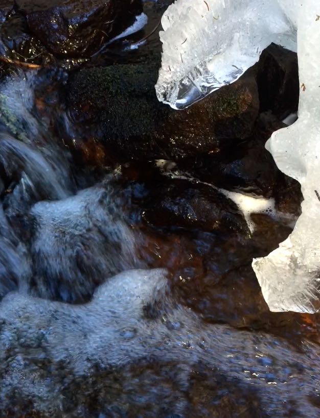 Kaffe och ostsmörgås smakar bäst i solglänta. Mandarin är vackrast mot marssnö. Efter två timmar här ute tror inte själen längre att det är bråttom. Det tror däremot vattnet som nyss var vitt och kramt. Hör hur det rusar, pånyttfött och spralligt, neråt neråt, framåt framåt!